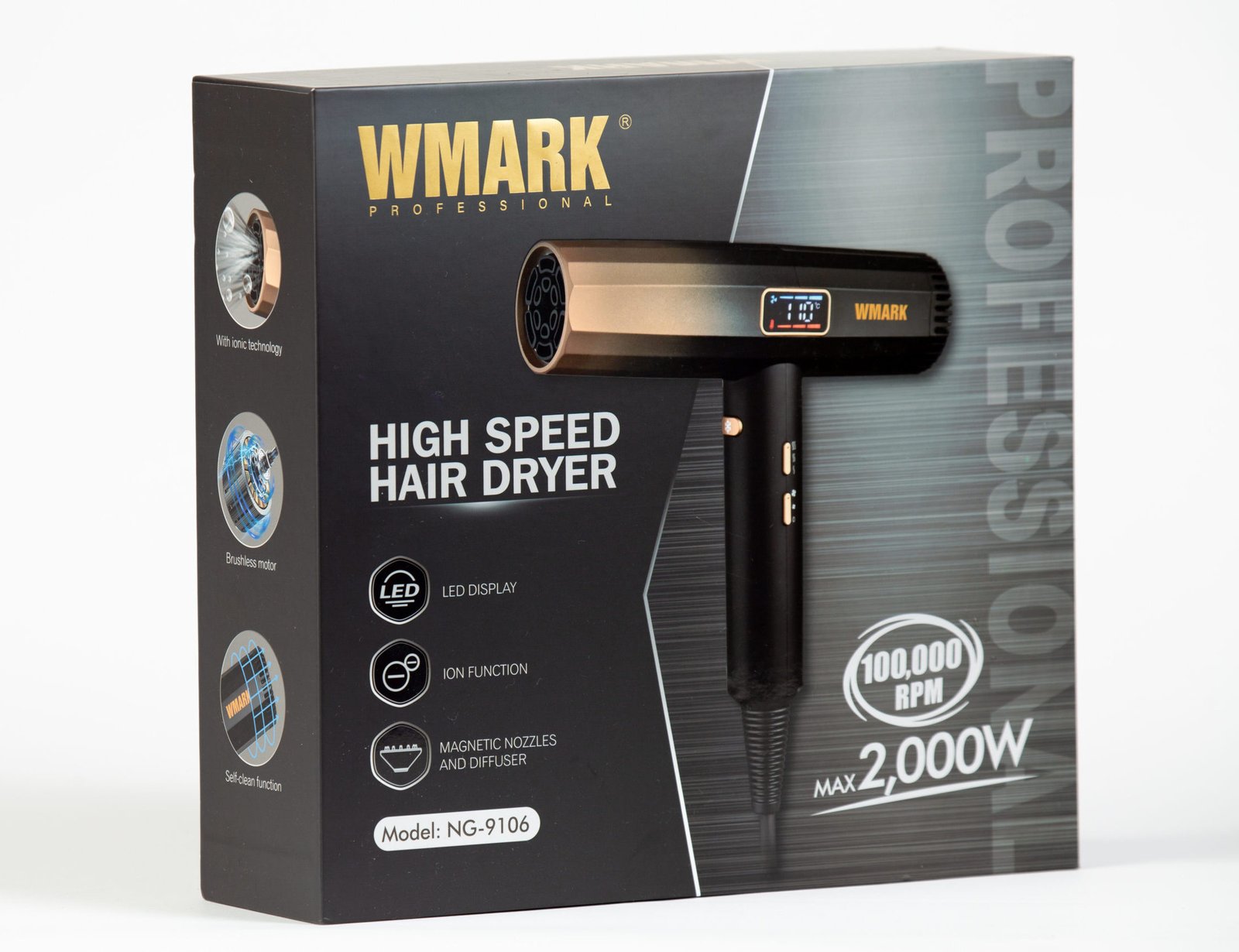 Secador WMARK NG-9106 es un secador profesional diseñado para estilistas y salones de belleza que necesitan herramientas potentes, rápidas y confiables. Este modelo ha sido creado para ofrecer un rendimiento superior en entornos profesionales donde el tiempo y la calidad son esenciales. Con su motor BLDC de 100000 RPM y tecnología iónica avanzada, garantiza un secado rápido, seguro y con resultados que cuidan la salud del cabello.